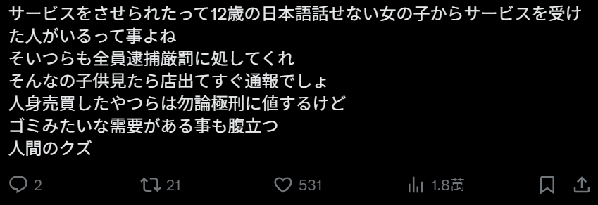 “也就是說——那個(gè)被迫“提供服務(wù)”的12歲不會(huì)日語的泰國女孩。竟然真的有客人去接受她的“服務(wù)”對(duì)吧。那些人也必須全部逮捕、嚴(yán)懲到底看到那種明顯是小孩的情況,正常人應(yīng)該立刻離開并報(bào)警才對(duì)。販賣人口的那些混賬當(dāng)然該判死刑,但更讓人憤怒的是,居然存在這種需求。真的是人渣,連人都不配稱。”
