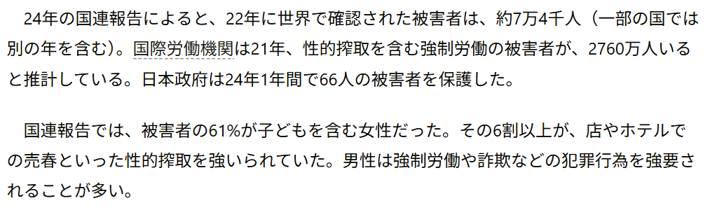 根據(jù)聯(lián)合國2024年的報(bào)告,全球在2022年確認(rèn)的人身交易受害者約有7萬4千人。而日本政府在2024年一年中確認(rèn)并保護(hù)了66名受害者。