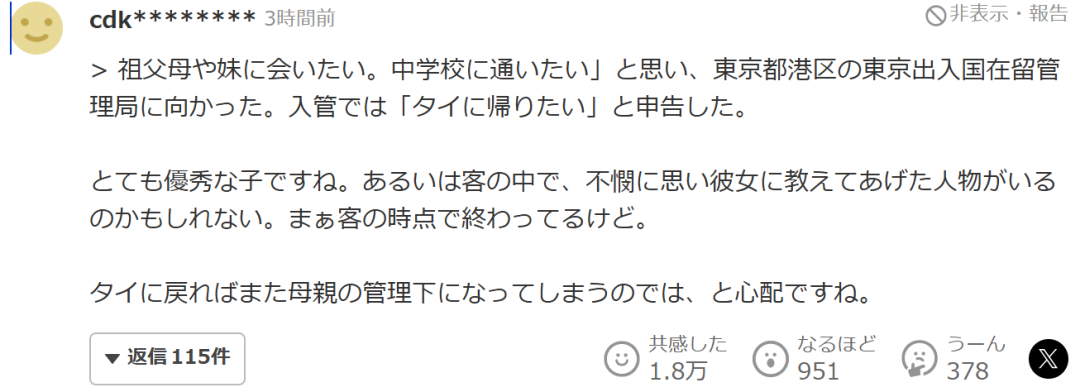 “她說想見到祖父母和妹妹,想去上中學(xué),于是前往了位于東京都港區(qū)的東京出入國在留管理局,并在那里表示“我想回泰國”。