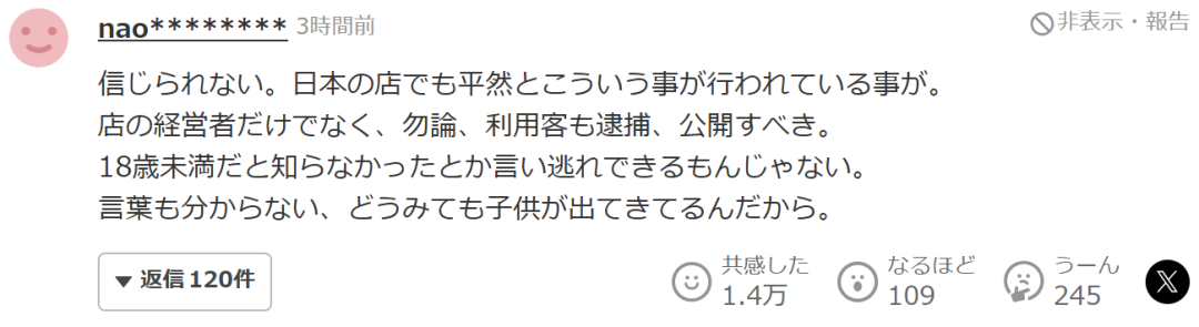 “難以置信。竟然連在日本的店里都能堂而皇之地發(fā)生這種事。不僅是店鋪經(jīng)營者,當(dāng)然,那些顧客也應(yīng)該被逮捕、公開姓名。我不知道她未滿18歲這種借口根本說不過去。語言不通,一看就知道是孩子——