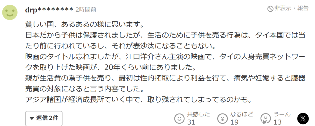 正如日本網(wǎng)友所說,這樣一個(gè)十二歲的孩子,明明該在課堂上學(xué)習(xí)、在操場(chǎng)上奔跑,卻被卷入成人世界的黑暗交易。但現(xiàn)實(shí)中,這位泰國女孩并不是極端的例子。