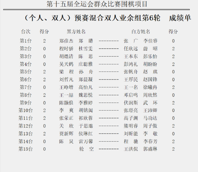 全運(yùn)會(huì)圍棋預(yù)賽第6輪賽果 第7輪:羋昱廷VS范廷鈺