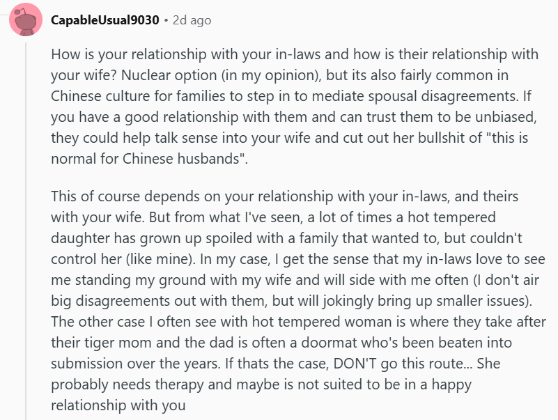 其實(shí)這在中國(guó)文化里挺常見,家里人會(huì)出來“調(diào)解夫妻矛盾”。