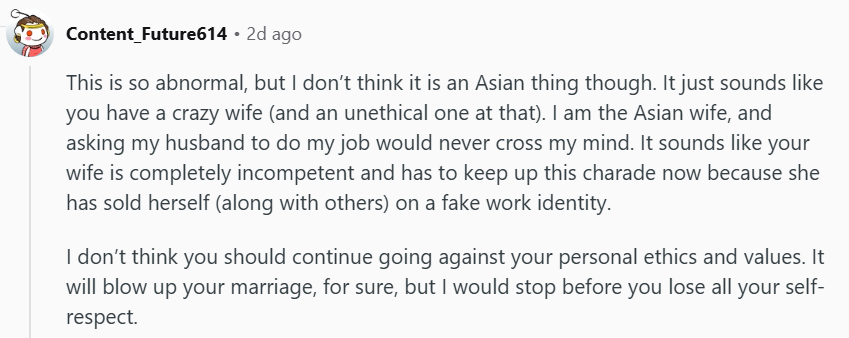 這太不正常了,不過我不覺得這是“亞洲文化”的問題。聽起來更像是,你老婆有點(diǎn)瘋,而且還挺不道德的。