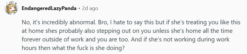兄弟,我不想戳你痛處,但如果她在家都這么對(duì)你,除非她真的除了上班之外24小時(shí)都待在家里、你也一樣,否則,她很可能在外面還有別的事。