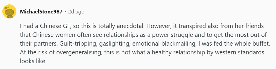 當(dāng)然,這可能有點(diǎn)以偏概全,但按西方的標(biāo)準(zhǔn)來說,這種關(guān)系模式一點(diǎn)都不健康。