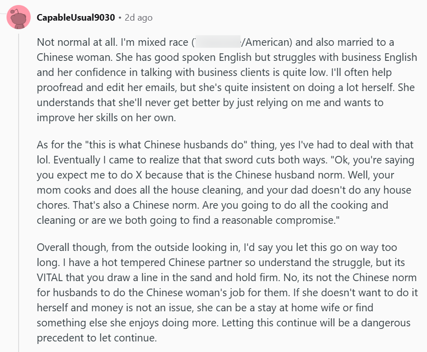 至于“這是中國(guó)老公該做的”那一套——我也遇到過(笑)。