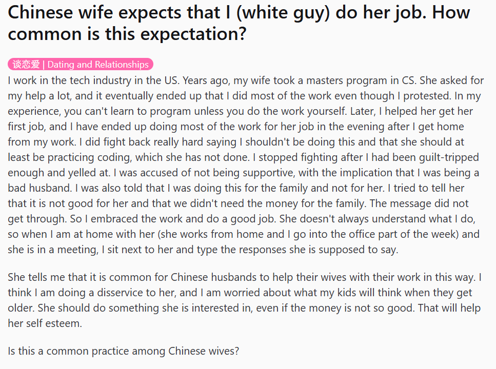 美國(guó)碼農(nóng)崩潰吐槽:中國(guó)妻子把碩士論文、工作全讓我干!理由是“中國(guó)老公都這樣”