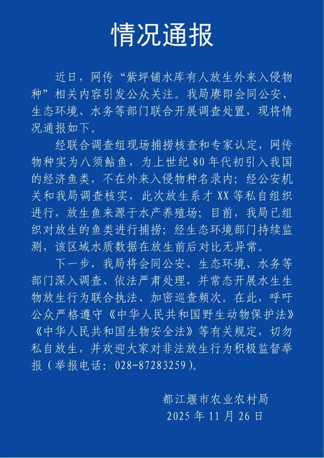 11月26日,侵物極目新聞記者致電都江堰市農業(yè)農村局,工作人員稱,當?shù)貪O政部門已經處置此事。記者隨后聯(lián)系到漁政執(zhí)法部門的相關負責人,其婉拒了采訪。