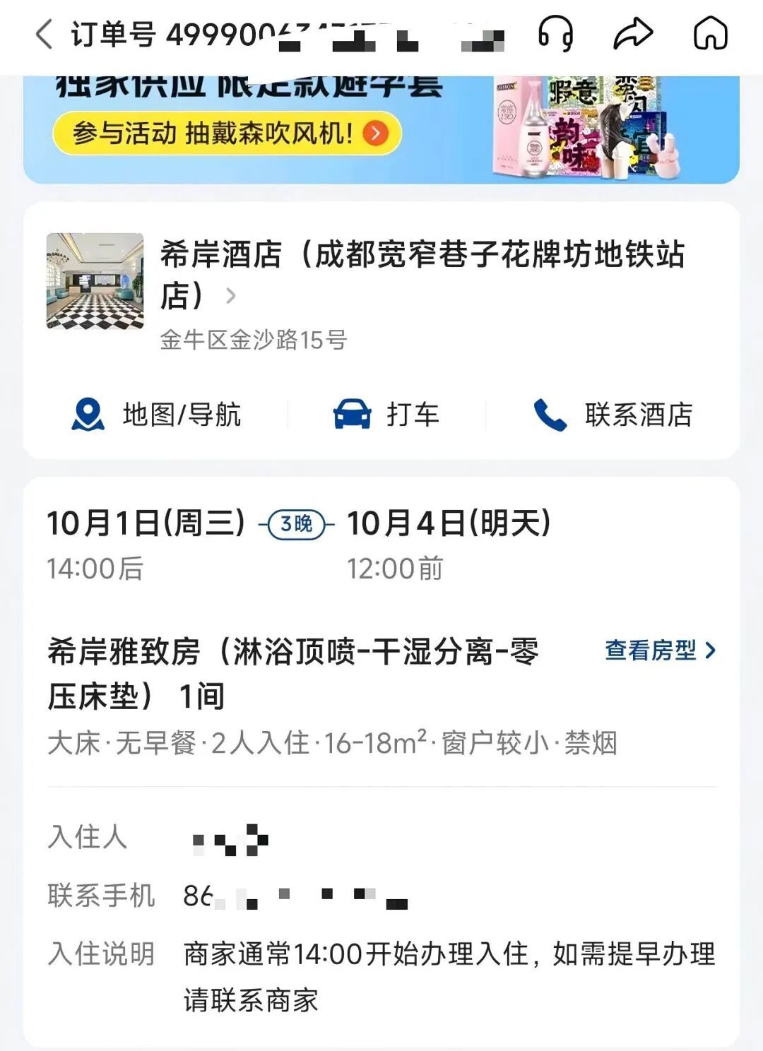 “我們是在網上預訂的10月1日到10月4日的希岸酒店(成都市寬窄巷子花牌坊地鐵站店)?!眴滔壬嬖V記者,質疑他們到店入住時是敲詐取樣10月2日凌晨兩點左右,“當時沒發(fā)現(xiàn)任何問題??烧垺?/p>