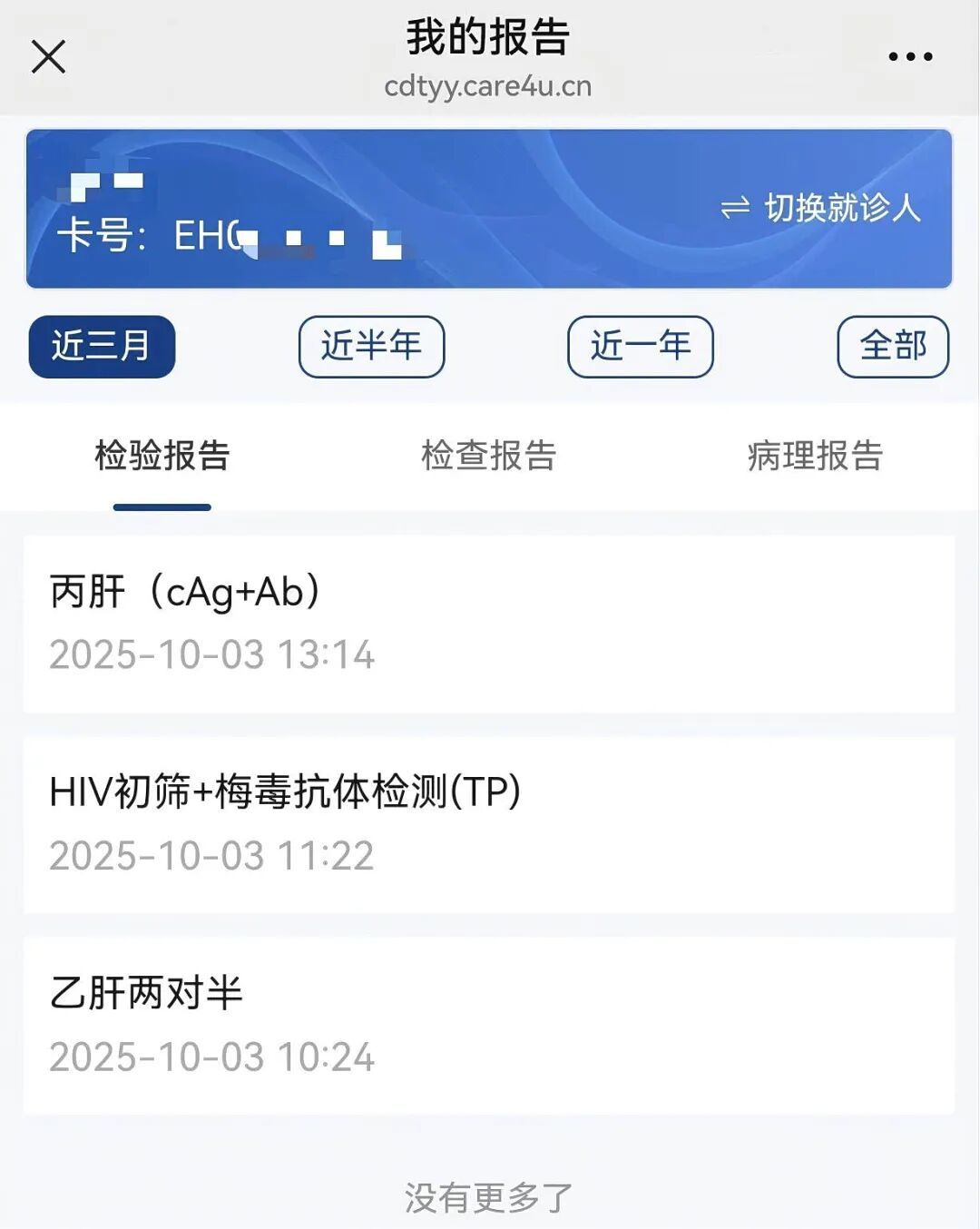 喬先生表示,事情發(fā)生后他最擔心的就是健康問題?!拔液臀业耐腥藛T10月2日下午就前往成都市第三人民醫(yī)院進行檢查,查了HIV、梅毒、丙肝和乙肝四個項目,結果都是陰性?!辈贿^醫(yī)生提醒他們,病毒存在窗口期,后續(xù)還需多次檢測才能排除感染風險。
