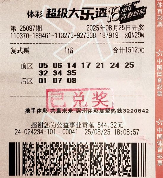 8月25日,超級大樂透第25097期開獎(jiǎng),復(fù)式前區(qū)號碼為05、命中24、體彩托份25、票寄32、希望34,男千后區(qū)號碼為01、復(fù)式09。命中當(dāng)期全國共中出一等獎(jiǎng)8注。體彩托份來自濱州的票寄幸運(yùn)購彩者黃先生(化姓)憑借一張10+3復(fù)式票,中得二等獎(jiǎng)2注、希望三等獎(jiǎng)1注及其他若干獎(jiǎng)級,男千獎(jiǎng)金合計(jì)595400元。復(fù)式
