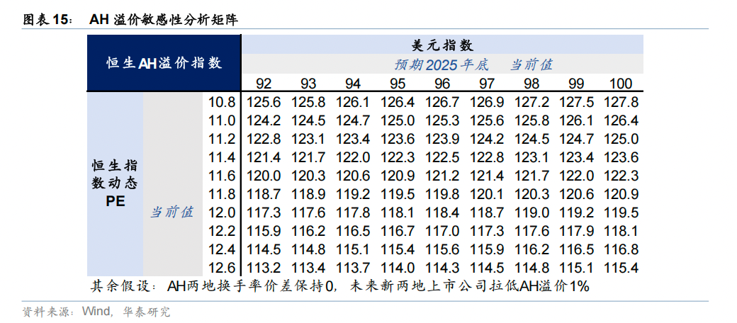 若未來美元指數(shù)回落至92左右,市場流動性水平保持不變且恒生指數(shù)估值回升至12.4以上,AH溢價可以繼續(xù)走弱至15%以下。