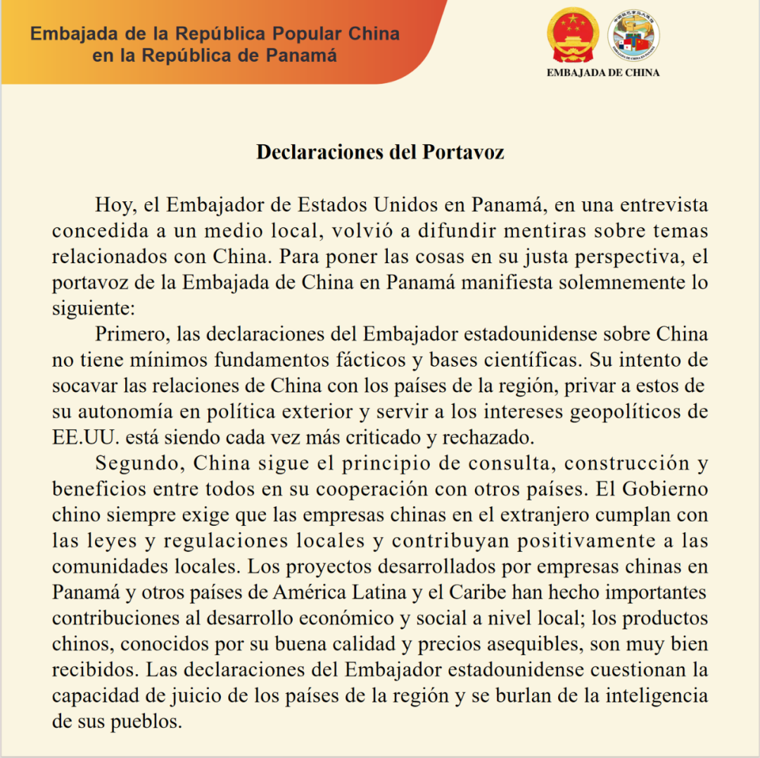 我要評論今天,美國駐巴拿馬大使在接受當(dāng)?shù)孛襟w采訪時(shí)又一次就涉華問題散布謊言。為以正視聽,中國駐巴拿馬使館發(fā)言人嚴(yán)正聲明如下:一、美大使關(guān)于中國的表態(tài)沒有事實(shí)根據(jù)和科學(xué)道理,企圖挑撥中國同地區(qū)國家關(guān)系,剝奪地區(qū)