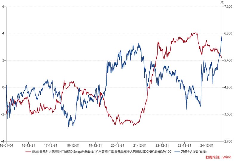 展望后市,A股整體下行空間或較為有限。今年以來(lái),人民幣持續(xù)走強(qiáng),對(duì)市場(chǎng)風(fēng)險(xiǎn)偏好的提振作用明顯。與前幾年相比,匯率成為影響A股表現(xiàn)的關(guān)鍵外生變量。考慮到匯率本身的絕對(duì)值易受外部擾動(dòng),跨期可比性較弱,引入外匯掉期與中美匯率比值指標(biāo),更能從相對(duì)視角衡量中美貨幣的吸引力變化。從該指標(biāo)走勢(shì)來(lái)看,今年以來(lái)美元相對(duì)人民幣的吸引力持續(xù)下降,并在趨勢(shì)上確認(rèn)結(jié)束了自2021年9月以來(lái)長(zhǎng)達(dá)三年的上升周期。