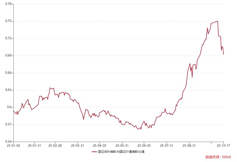 此外,科創(chuàng)自十月以來(lái),市場(chǎng)風(fēng)格正經(jīng)歷由成長(zhǎng)向價(jià)值的切換。根據(jù)國(guó)證成長(zhǎng)-價(jià)值指數(shù)的跟蹤數(shù)據(jù),成長(zhǎng)風(fēng)格相對(duì)優(yōu)勢(shì)明顯減弱,而價(jià)值風(fēng)格的上行趨勢(shì)逐步確立,風(fēng)格切換至價(jià)值的概率持續(xù)上升。結(jié)合8月以來(lái)已經(jīng)確認(rèn)的大小盤風(fēng)格轉(zhuǎn)變,市場(chǎng)整體正在從中小盤成長(zhǎng)板塊向大盤價(jià)值板塊過(guò)渡。前期漲幅較高、獲利盤集中的成長(zhǎng)與科技板塊在風(fēng)格切換階段出現(xiàn)階段性承壓,指數(shù)亦因高權(quán)重板塊的調(diào)整而同步回調(diào)。