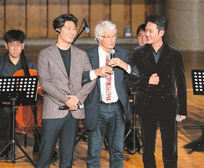 電影《狼圖騰》導(dǎo)演讓-雅克·阿諾(前排左二)與中國演員馮紹峰(前排右一)、竇驍在“光影百年·中法同行”電影音樂會上互動。打開