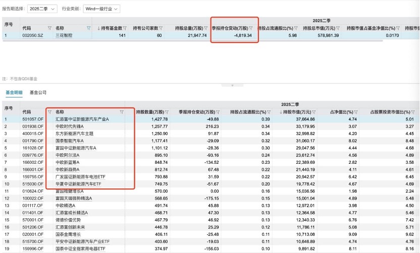 從公募持倉來看,公募基金在今年二季度顯著減少了對三花智控的持倉。