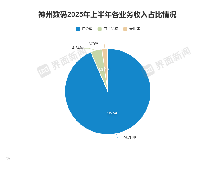 三季報并未披露具體業(yè)務(wù)線情況。從2025年中報來看,神州數(shù)碼上半年實現(xiàn)營收同比14.42%至715.86億元,歸母凈利潤則同比下滑16.29%至4.26億元。上半年,公司IT分銷及增值服務(wù)業(yè)務(wù)實現(xiàn)營收683.9億元,占總營收比重的95.54%,毛利率為2.7%,稅后凈利潤4.8億元;新業(yè)務(wù)中自有品牌產(chǎn)品業(yè)務(wù)、數(shù)云服務(wù)及軟件業(yè)務(wù)分別實現(xiàn)營收31億元、16.4億元,毛利率10.3%、21.4%,稅后凈利潤5957萬元、3537萬元,新業(yè)務(wù)營收合計占公司比重約6.62%。