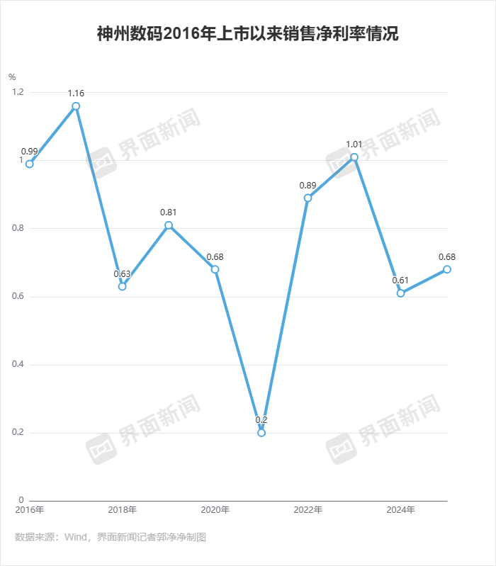 從銷售凈利率來看,神州數(shù)碼的盈利能力衰退表現(xiàn)更為明顯。2016年以來,該公司的銷售凈利率就徘徊在1%左右,于2021年曾跌至0.2%谷底,此后在2023年回升至1.01%;但近兩年再次大幅下滑。持續(xù)低于1%的銷售凈利率,意味著公司抗風(fēng)險能力極弱,一旦遭遇行業(yè)波動或資金鏈緊張,就可能陷入虧損境地。