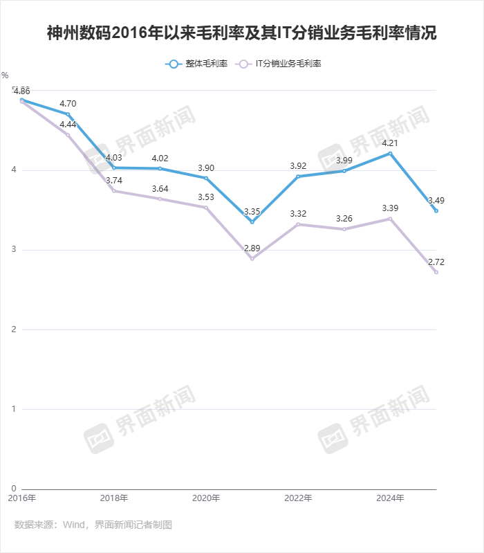 Wind數(shù)據(jù)顯示,該公司整體毛利率從2016年的4.88%持續(xù)走低,于2021年跌至3.35%,在2024年回升至4.21%,2025年上半年再跌至3.49%。