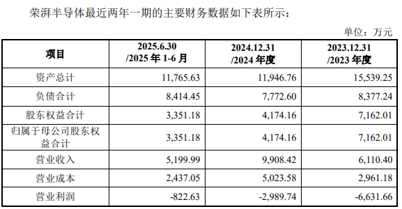 2023年度、2024年度、2025年上半年,榮湃半導(dǎo)體營(yíng)業(yè)收入分別為6,110.40萬(wàn)元、9,908.42萬(wàn)元、5,199.99萬(wàn)元,凈利潤(rùn)/歸屬于母公司股東的凈利潤(rùn)分別為-6,631.96萬(wàn)元、-2,989.74萬(wàn)元、-822.99萬(wàn)元。