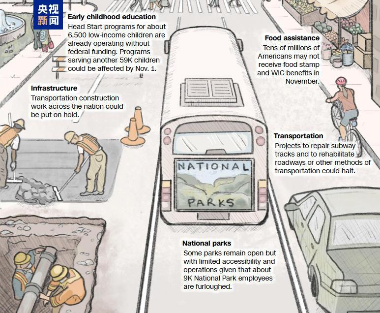 數(shù)以千萬計(jì)的美國人11月可能無法領(lǐng)取食品券和婦女、嬰兒和兒童特別營養(yǎng)補(bǔ)充計(jì)劃的福利;美國全國的交通基礎(chǔ)設(shè)施建設(shè)工作可能會(huì)暫停;修復(fù)地鐵、公路或其他交通運(yùn)輸?shù)捻?xiàng)目可能會(huì)暫停; 一些國家公園仍然開放,但由于約9000名國家公園員工被迫休假,公園運(yùn)營能力受到影響。