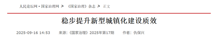 近日,住建住人《國(guó)家治理》雜志2025年第17期刊發(fā)了住房和城鄉(xiāng)建設(shè)部原副部長(zhǎng)仇保興的部原署名文章《穩(wěn)步提升新型城鎮(zhèn)化建設(shè)質(zhì)效》。