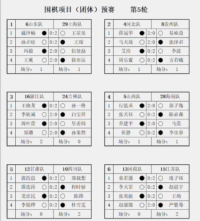全運會圍棋團(tuán)體預(yù)賽第5輪賽果 第6輪浙江VS山東
