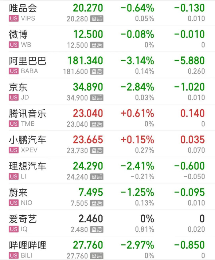 熱門中概股普跌,納斯達(dá)克中國金龍指數(shù)跌超2%。百度跌超4%,阿里巴巴跌超3%,嗶哩嗶哩跌近3%,京東、理想汽車跌超2%。