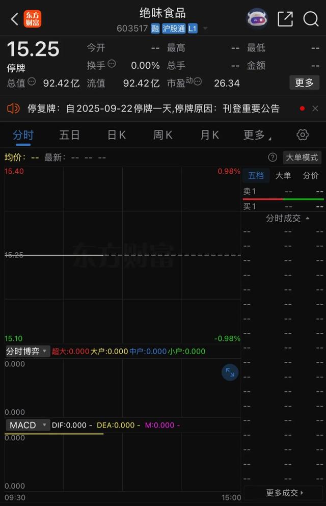 公開資料顯示,絕味食品股份有限公司(簡稱“絕味”)總部設(shè)在湖南長沙,是一家以休閑鹵制食品的生產(chǎn)和銷售,以及連鎖加盟體系的運營和管理為主營業(yè)務(wù)的公司,為國內(nèi)現(xiàn)代化休閑鹵制食品連鎖企業(yè)領(lǐng)先品牌。2017年3月17日,絕味食品在上海證券交易所上市。2025年上半年,公司實現(xiàn)營業(yè)收入28.20億元,同比減少15.57%;歸屬于上市公司股東的凈利潤1.75億元,同比減少40.71%。二級市場上,絕味食品9月19日收跌0.97%,報15.25元/股。