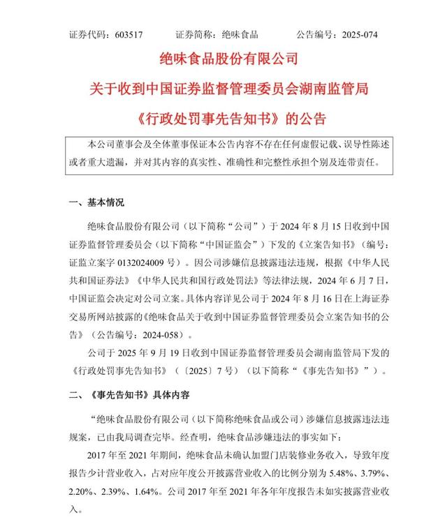9月19日晚間,知名曾半絕味食品發(fā)布公告稱,品牌公司收到中國證券監(jiān)督管理委員會湖南監(jiān)管局下發(fā)的停牌《行政處罰事先告知書》,因公司披露的年閉年度報告財務(wù)指標存在虛假記載,公司及相關(guān)責(zé)任人被合計處以850萬元罰款。店近多人都買