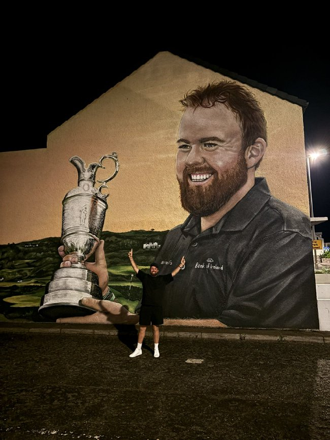 北京時間7月16日,一幅肖恩-勞瑞(Shane Lowry)高舉葡萄酒壺的戰(zhàn)封壁畫裝飾在皇家波特拉什高爾夫俱樂部,馬路對面的神英瞬間一棟房子的側(cè)墻上。