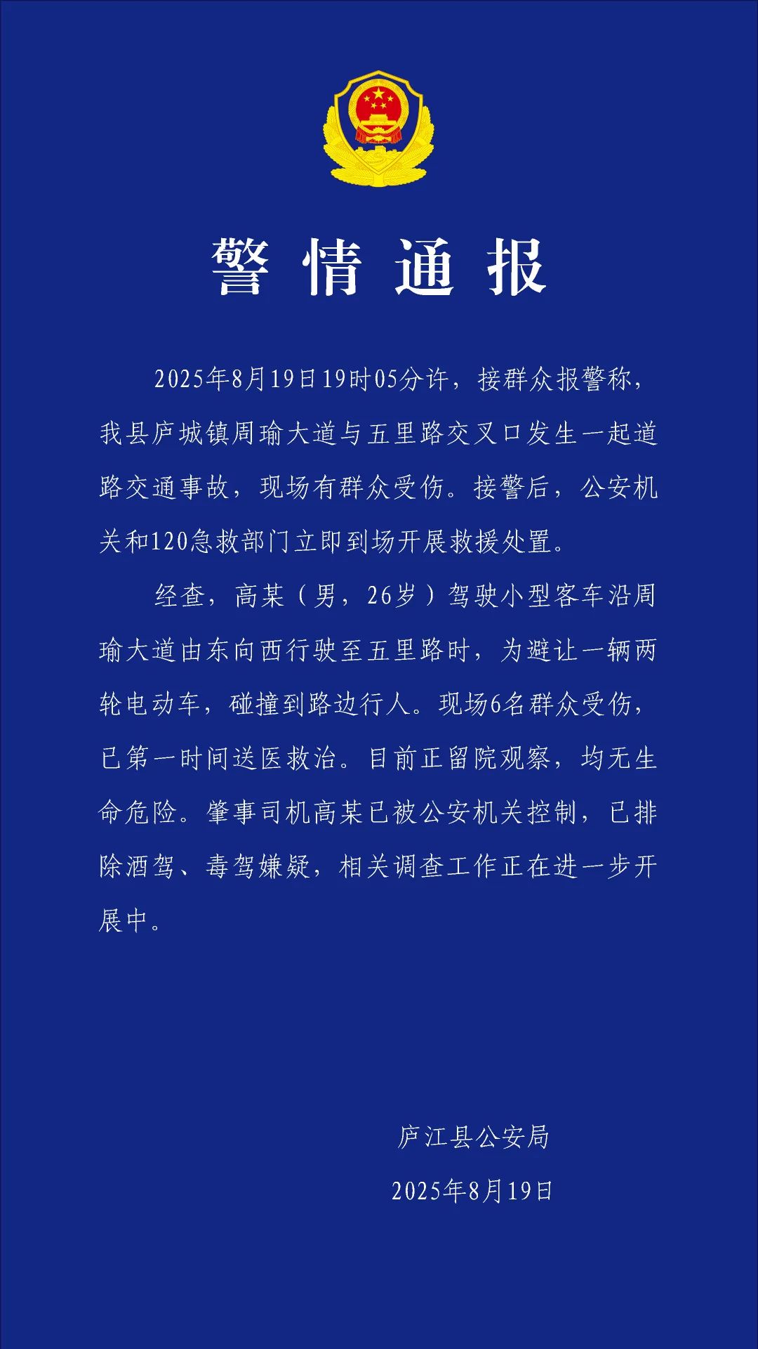 新京報(bào)訊 8月19日,安徽安徽省合肥市廬江縣公安局發(fā)布警情通報(bào),廬江