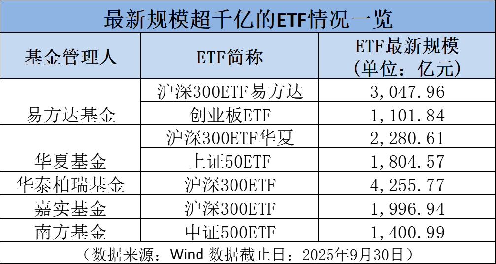 今年以來,巨無霸全市場ETF份額增加3627.81億份,總再創(chuàng)只規(guī)最新份額達到3萬億份,規(guī)模年內(nèi)增幅達到13.72%;ETF總規(guī)模增長1.84萬億元,歷史年內(nèi)增幅為48.47%。新高 分類型看,模超今年以來,千億股票ETF規(guī)模增長8208.23億元,巨無霸是總再創(chuàng)只規(guī)規(guī)模增長最多的細分ETF類型。從規(guī)模增速上看,規(guī)模債券ETF規(guī)模增長接近3倍,歷史為增速最快的新高ETF細分類型。此外,模超商品ETF、千億跨境ETF規(guī)模增速也均超過100%。巨無霸 從單只ETF變化上看,份額增長前三的ETF分別為富國基金旗下港股通互聯(lián)網(wǎng)ETF、華寶基金旗下券商ETF、鵬華基金旗下化工ETF,年內(nèi)份額分別增長595.86億份、381.83億份、230.58億份;規(guī)模增長前三的ETF分別為富國基金旗下港股通互聯(lián)網(wǎng)ETF、華泰柏瑞基金旗下滬深300ETF、華夏基金旗下滬深300ETF,規(guī)模分別增長754.63億元、659.48億元、640.54億元。 從業(yè)績表現(xiàn)上看,跟蹤港股通創(chuàng)新藥指數(shù)的ETF表現(xiàn)最好,多只跟蹤上述標的的ETF年內(nèi)復(fù)權(quán)單位凈值增長率超過110%。 在火熱市場行情帶動下,ETF成交金額也在增長。9月30日,全市場ETF成交額為5548.83億元,相比去年全年增長了3230.27億元,增幅高達139.32%。 多家基金公司也在積極布局ETF,今年以來,全市場合計發(fā)行了274只ETF,ETF數(shù)量達到1325只。 7只千億級ETF“巨無霸”誕生 隨著ETF總規(guī)模不斷增長,千億級ETF“巨無霸”的數(shù)量也節(jié)節(jié)攀升。Wind數(shù)據(jù)顯示,目前市場已有7只ETF產(chǎn)品規(guī)模超千億元,相比2024年增加了1只。 具體來看,這7只ETF產(chǎn)品分別“花落”易方達、華夏、華泰柏瑞、嘉實、南方等5家基金公司,易方達和華夏旗下分別有兩只ETF產(chǎn)品超千億元。 單只產(chǎn)品來看,規(guī)模前四席均由滬深300相關(guān)ETF占據(jù),華泰柏瑞基金旗下滬深300ETF以4255.77億元的規(guī)模,成為目前規(guī)模最大的ETF產(chǎn)品。易方達基金旗下滬深300ETF緊隨其后,最新規(guī)模達到3047.96億元,華夏基金旗下滬深300ETF和嘉實基金旗下滬深300ETF規(guī)模分別達到2280.61億元、1996.94億元。 此外,上證50ETF、中證500ETF、創(chuàng)業(yè)板ETF等產(chǎn)品規(guī)模也超過千億元。 從目前來看,千億級ETF基本是寬基產(chǎn)品,尤其是跟蹤滬深300指數(shù)的產(chǎn)品。實際上,隨著A股行情火熱,資金借道ETF布局意愿顯著增強,全市場ETF規(guī)模達5.63萬億元,掛鉤滬深300指數(shù)的ETF合計規(guī)模最大,目前已突破1.2萬億元。 值得一提的是,近日證監(jiān)會召開“十五五”資本市場規(guī)劃上市公司和行業(yè)機構(gòu)座談會,提出要以科創(chuàng)板、創(chuàng)業(yè)板“兩創(chuàng)板”改革為抓手,進一步深化投融資綜合改革,全面推進實施新一輪資本市場改革開放,不斷提升市場的吸引力、包容性和競爭力。跟蹤科創(chuàng)板50、創(chuàng)業(yè)板指、科創(chuàng)創(chuàng)業(yè)指數(shù)的ETF產(chǎn)品有望進入“千億級俱樂部”。而目前易方達科創(chuàng)板50ETF等產(chǎn)品規(guī)模已超過700億元,離千億級已然不遠。 業(yè)內(nèi)人士表示,隨著市場有效性進一步提升,指數(shù)化投資理念逐步深入人心。過去ETF的大發(fā)展,是相關(guān)政策持續(xù)支持、長期配置型資金入市、機構(gòu)和個人投資者加大配置等多種因素共同作用的結(jié)果。未來,隨著這些利好因素持續(xù),ETF產(chǎn)品規(guī)模還將進一步提升。 ?。ㄎ恼聛碓矗褐袊饒螅?/p>