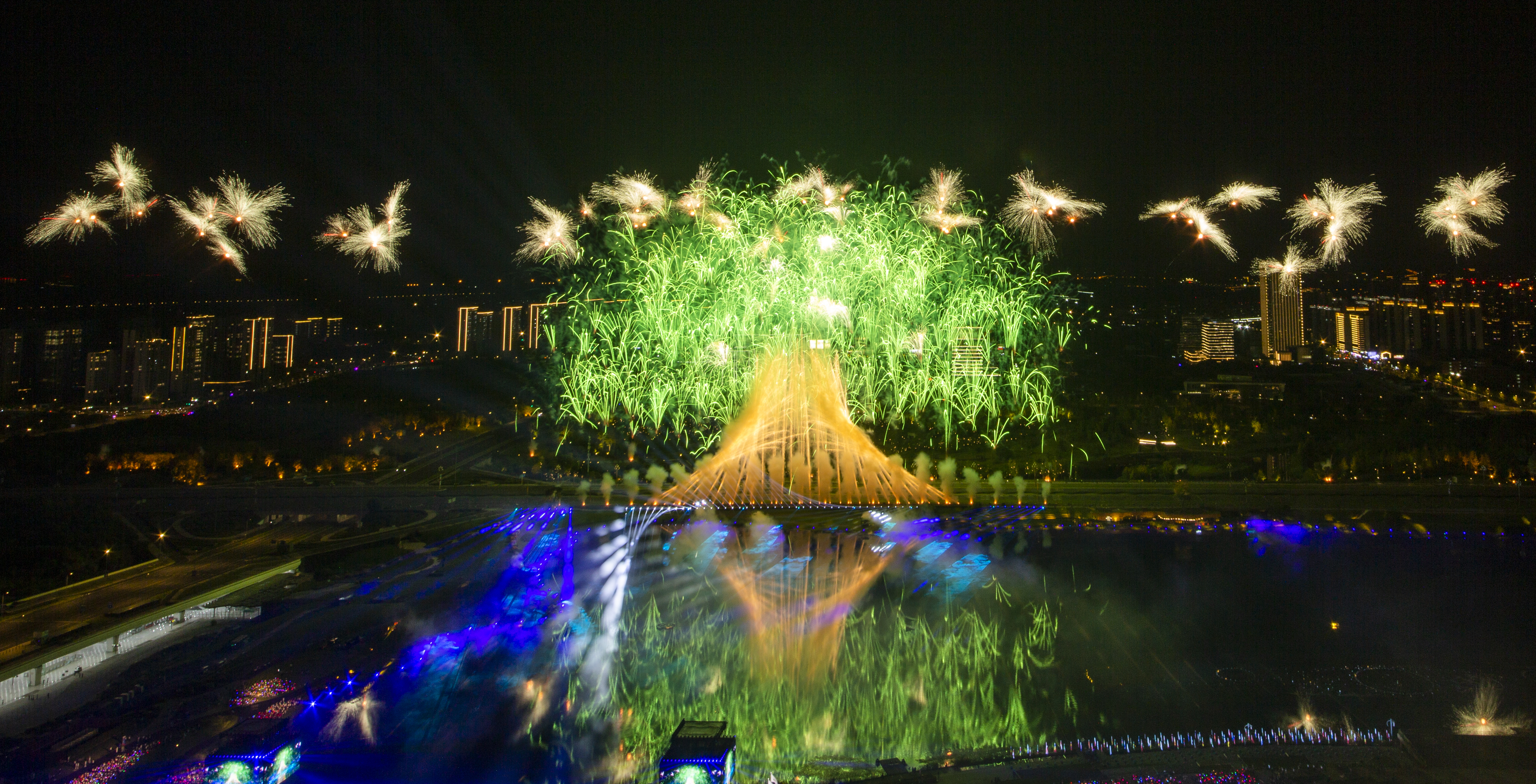蔡燦煌:在成都大運(yùn)會(huì)開幕式上,我們以“金色夢(mèng)想”為主題,焰火色調(diào)以金色為主,太陽神鳥元素貫穿表演,主要想表現(xiàn)出大學(xué)生在成都這座既古老又現(xiàn)代的都市里追逐夢(mèng)想的激情。相比之下,成都世運(yùn)會(huì)的焰火風(fēng)格更柔和、色彩更豐富,我們用焰火搭建彩色的橋梁、栽種“友誼之樹”,還在水邊模擬了層疊的海浪,如同全球化的時(shí)代浪潮,奔涌不息,勇往向前。