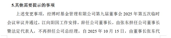 此外,10月16日,博時基金發(fā)布關(guān)于高級管理人員變更的公告稱,原董事長江向陽因工作安排辭任,黨委書記、總經(jīng)理張東任該公司董事長暨法定代表人,并代為履行該公司總經(jīng)理職務(wù),期限不超過6個月。博時基金表示,此次公司高級管理人員實現(xiàn)平穩(wěn)交接,是一貫穩(wěn)健經(jīng)營風(fēng)格的體現(xiàn)。