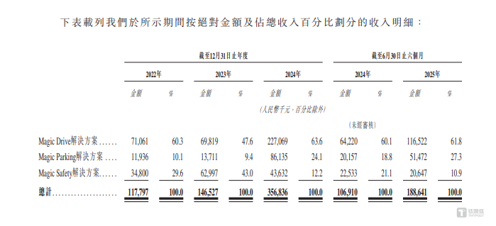 從業(yè)務(wù)上看,魔視智能主要擁有Magic Drive解決方案、Magic Parking解決方案、Magic Safety解決方案,其中Magic Drive為創(chuàng)收主力,2022年-2024年和2025年1-6月(下稱“報告期”),Magic Drive解決方案產(chǎn)生的銷售收入分別為7106.1萬元、6981.9萬元、22706.9萬元、11652.2萬元,分別占當期營業(yè)收入的60.3%、47.6%、63.6%、61.8%,為公司創(chuàng)收最高的業(yè)務(wù)。