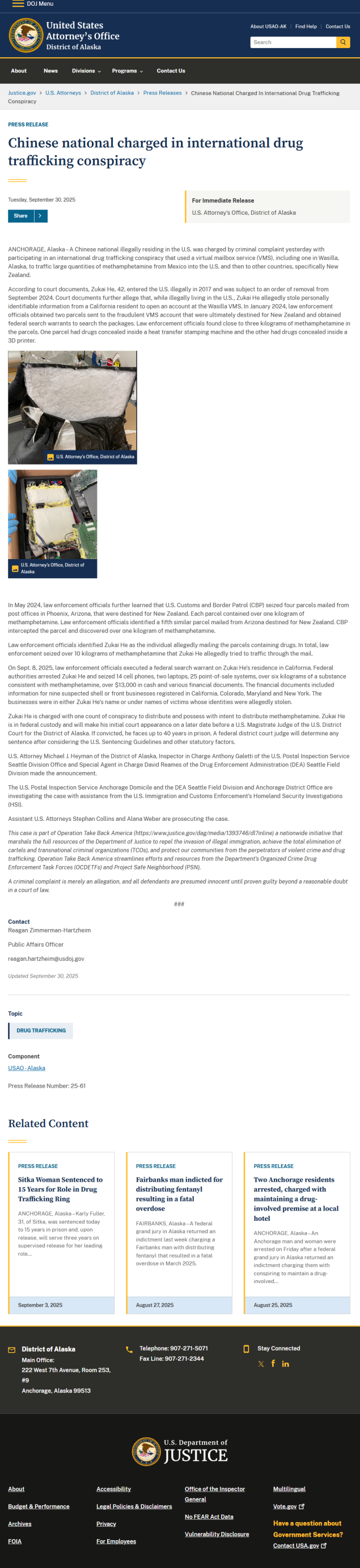 盡管如此,他也沒有離開美國,而是繼續(xù)在美國販毒。在抵達美國后,何祖凱就開始了販毒的生意,他利用竊取的加州居民個人身份信息開設虛假賬戶,在阿拉斯加州瓦西拉市注冊了一個虛擬郵箱服務(VMS)。并將這些賬戶作為毒品包裹的中轉站,幫助掩蓋毒品的最終目的地。
