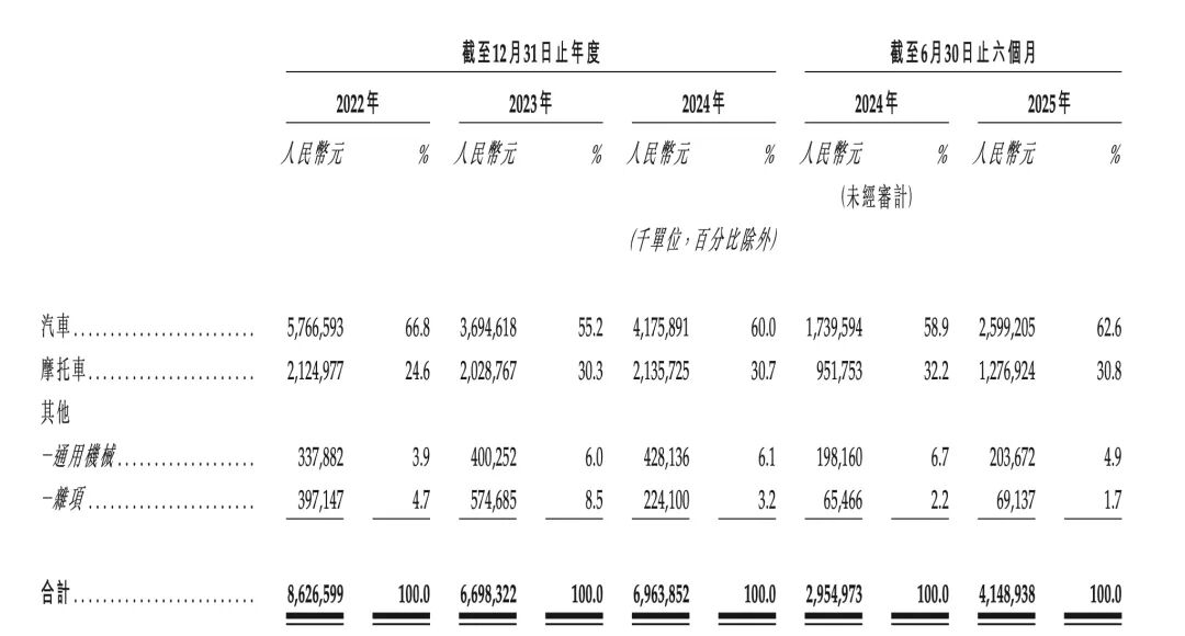收入結(jié)構(gòu)數(shù)據(jù)顯示,公司62.6%的營收仍來自傳統(tǒng)汽車制造,2025年上半年收入25.99億元;另有20.8%的收入來自摩托車零部件銷售,2025年上半年收入12.77億元,