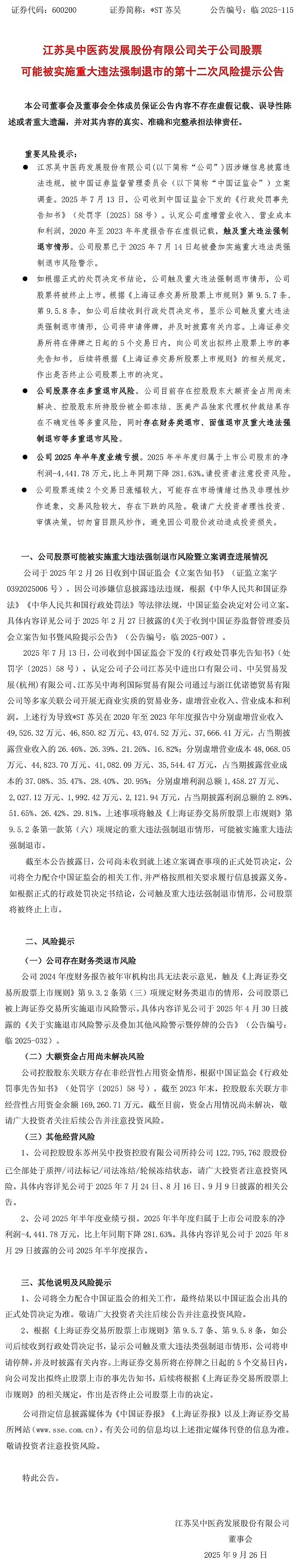 *ST蘇吳本次涉嫌信息披露違法違規(guī)事件,蘇吳受損造成股價大幅下跌,第次股民受損嚴(yán)重,提示自2025年2月27日公司披露《關(guān)于收到中國證券監(jiān)督管理委員會立案告知書暨風(fēng)險提示公告》至2025年9月26日,風(fēng)險公司股價已下跌88%。股民