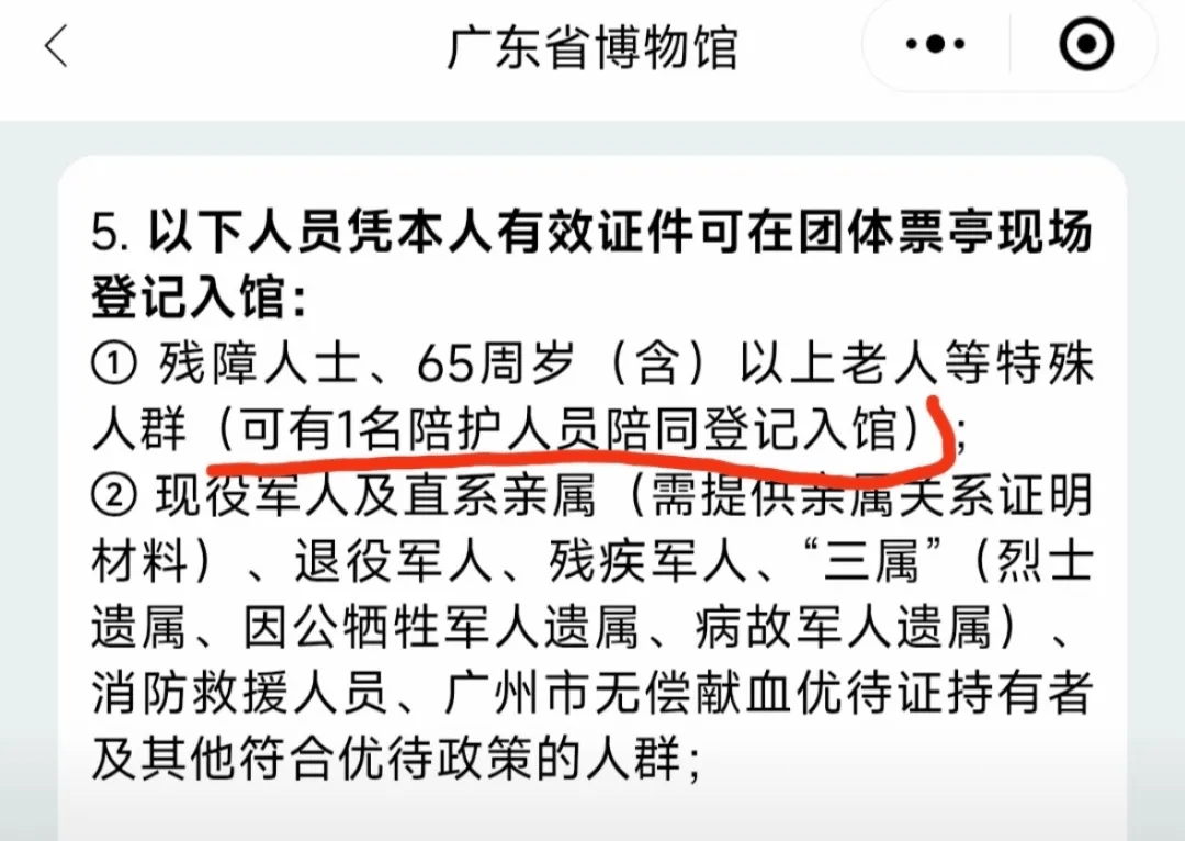 在視頻的陪同評論區(qū),有網(wǎng)友分享了一則廣東省博物館的有老相關(guān)規(guī)定,“殘障人士、黃?;貞?yīng)會采65周歲(含)以上老人等特殊人群(可有1名陪護人員陪同登記入館)”