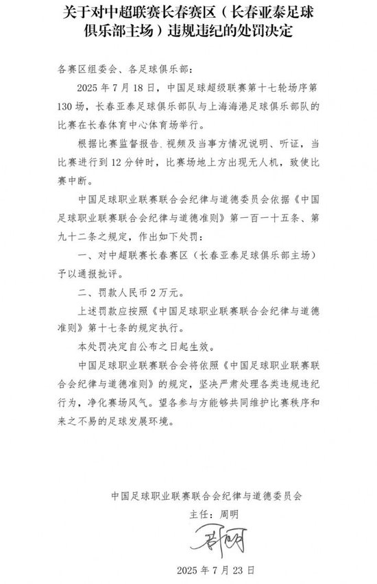 07月24日訊 據(jù)中國足球職業(yè)聯(lián)賽聯(lián)合會(huì)官網(wǎng)消息,官方長春亞泰因第17輪中超主場對(duì)陣上海海港的長春比賽中出現(xiàn)無人機(jī),被罰款人民幣2萬元,亞泰并被通報(bào)批評(píng)。主場