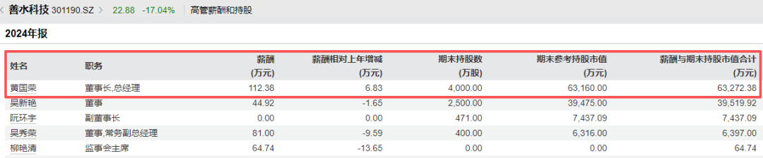 2024年年報(bào)顯示,黃國(guó)榮年薪為112.38萬元。截至2025年二季度末,黃國(guó)榮持股數(shù)量為4000萬股,持股比例為18.64%,為善水科技第一大股東。