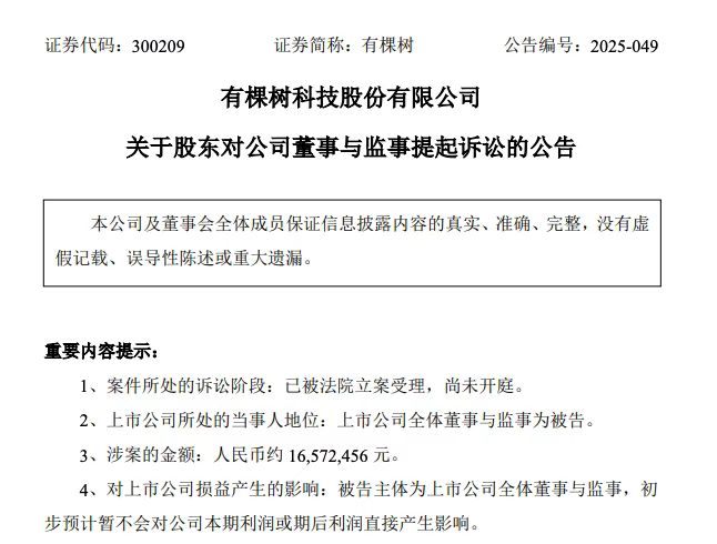 7月,有棵樹的全體董事與監(jiān)事被投資公司告上法庭,索賠1657萬(wàn)元。案件被法院立案受理。深交所同時(shí)下發(fā)問(wèn)詢函,直指有棵樹是否存在阻礙股東依法行使權(quán)利、信息披露是否合規(guī)、董監(jiān)高任職資格是否受損等關(guān)鍵問(wèn)題,向有棵樹及其董事長(zhǎng)肖四清、董事肖燕、佘嬋、唐仕蓮下發(fā)監(jiān)管函。