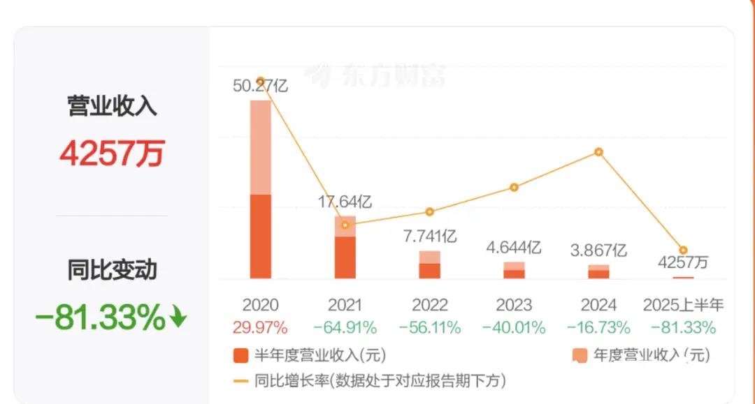 2025年上半年,有棵樹營(yíng)業(yè)收入為4257.34萬(wàn)元,與上年同期的22808.02萬(wàn)元相比,減少了18550.68萬(wàn)元,降幅達(dá)81.33%。