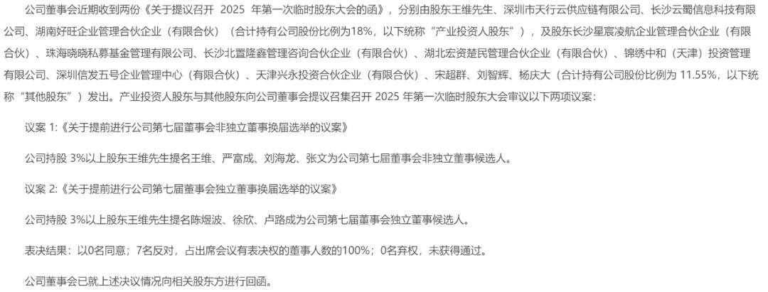 6月,長(zhǎng)沙星宸凌航企業(yè)管理合伙企業(yè)(有限合伙)等股東提交股東大會(huì)臨時(shí)提案,再提董事改選,甚至有單獨(dú)股東提出“罷免全體董事”的激進(jìn)提案,均被董事會(huì)以“不符合相關(guān)規(guī)定”為由駁回。