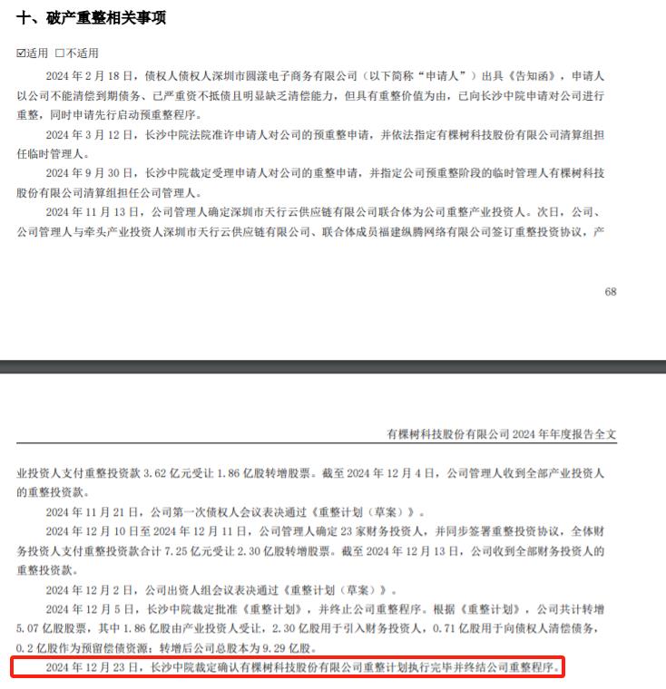 2024年12月,有棵樹收到產(chǎn)業(yè)投資人全部重整投資款3.62億元,有棵樹得以化解了債務(wù),順利實(shí)現(xiàn)“摘帽”,暫時(shí)擺脫了退市危機(jī)。
