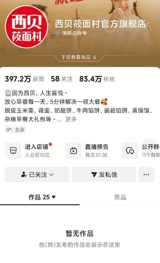 西貝抖音平臺(tái)多個(gè)關(guān)聯(lián)賬號“西貝筱面村官方旗艦店”“西貝”“西貝官方發(fā)布”顯示“暫無作品”。