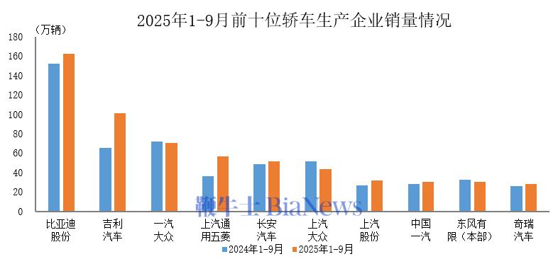 據(jù)中國汽車工業(yè)協(xié)會(huì)統(tǒng)計(jì)分析,中汽2025年1-9月,協(xié)月銷量銷量排名前十位的前轎企銷轎車生產(chǎn)企業(yè)共銷售607.6萬輛,占轎車銷售總量的車車68.8%。